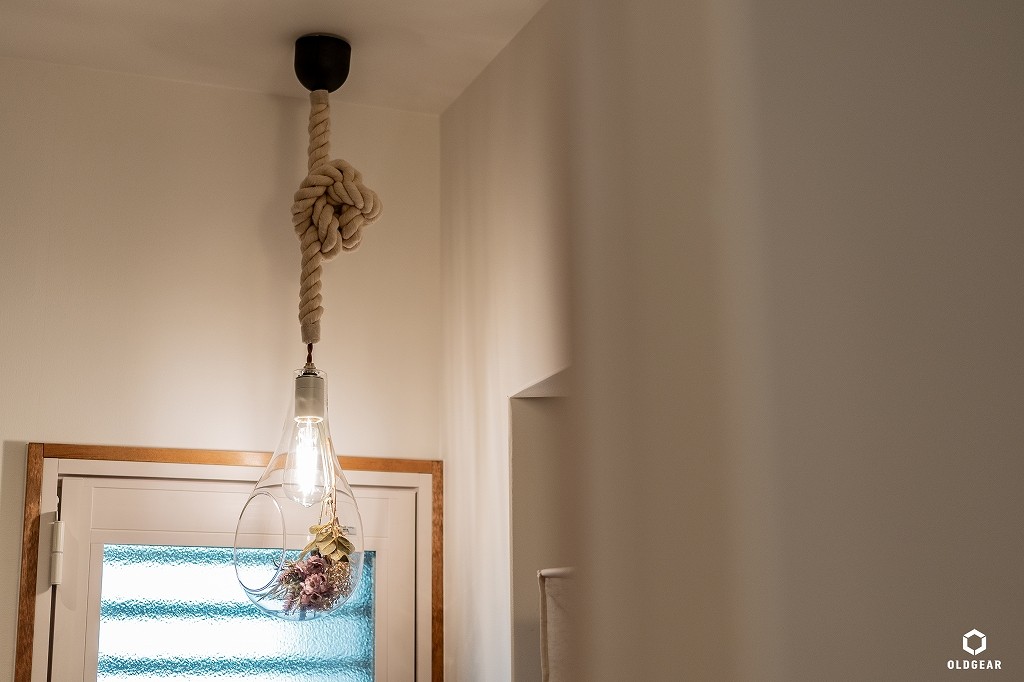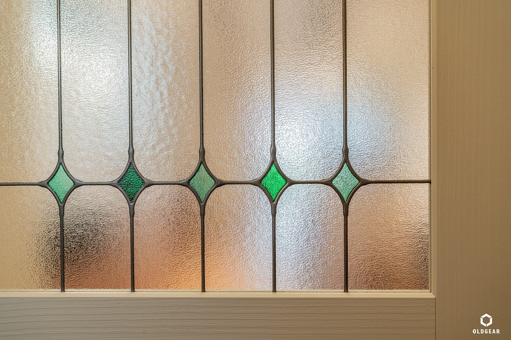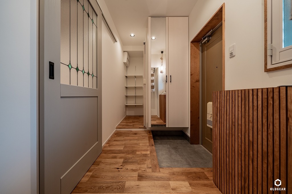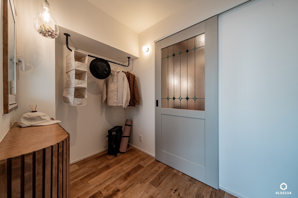 休日は自然の中を自転車で走ったり、ジムやヨガでリフレッシュ。そんなライフスタイルを想定した住まいは、玄関に自転車やリュックが置けるスペースと、アウターを掛けるハンガーパイプを設置。ステンドグラスを採用したドアを開けると、院展奨励賞を受賞の日本画がお出迎え。