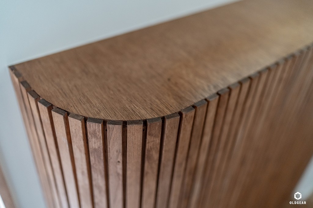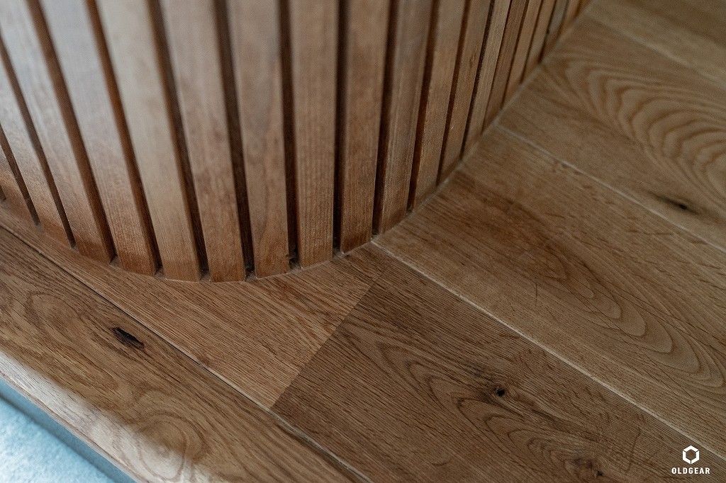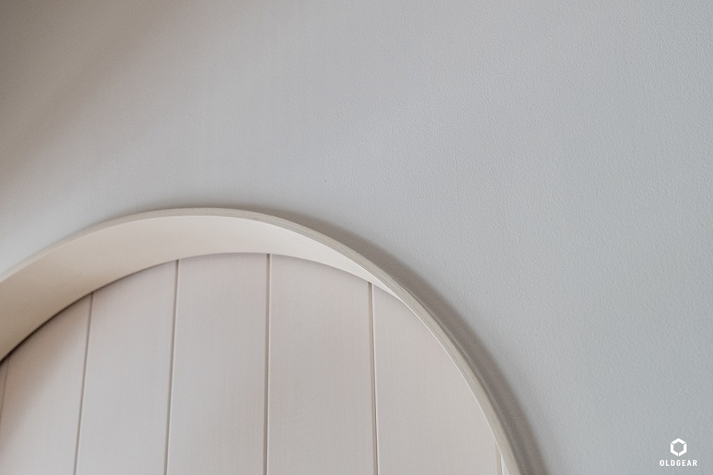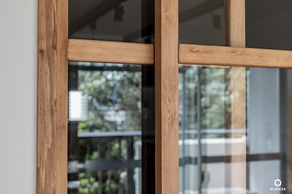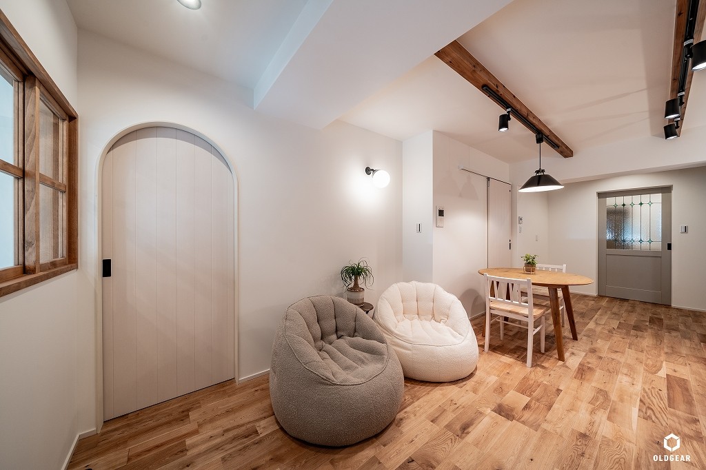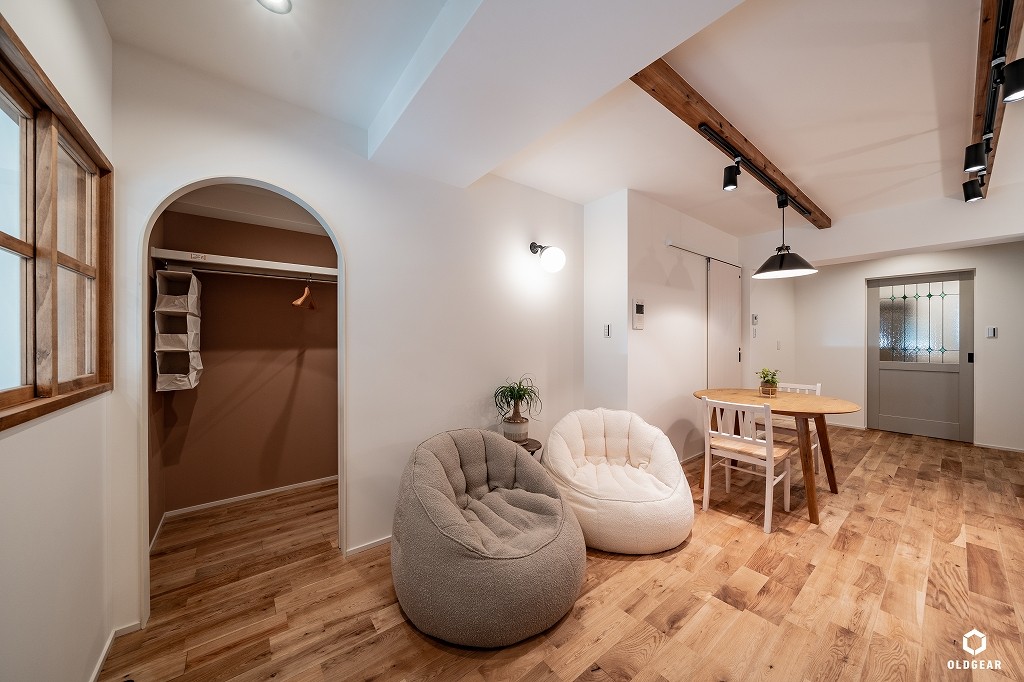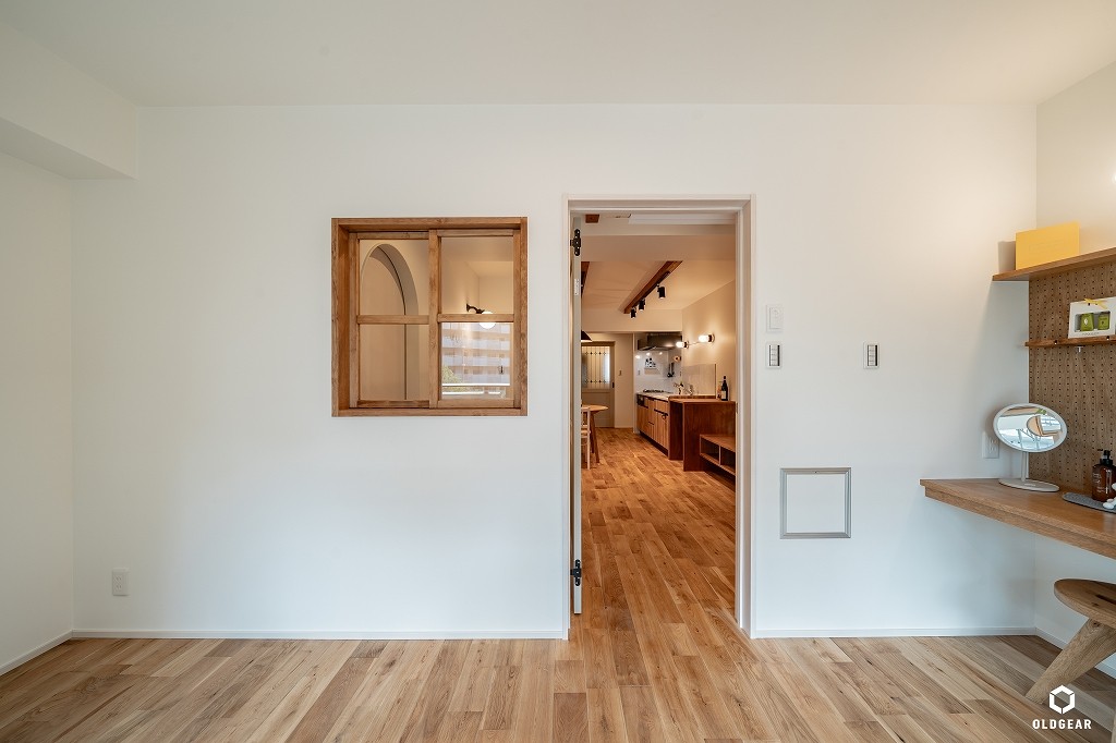 天井の見せ梁や無垢のフローリング、木枠の室内窓、そしてアーチ型のウォークインクローゼット入口など、細部にまでこだわり、自然素材ならではの木ぬくもりとデザイン性。