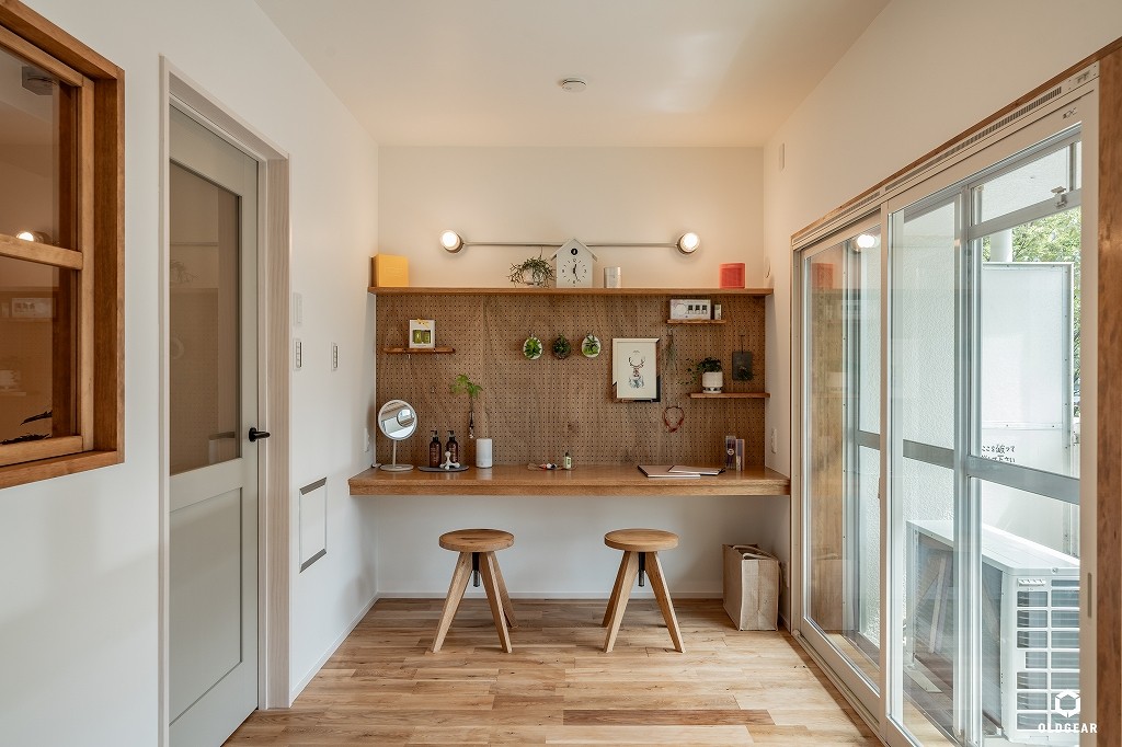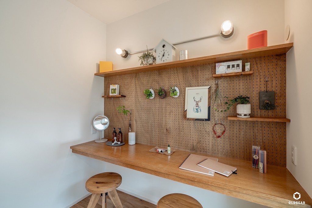 また、主寝室には造作デスクと有孔ボードを備え、仕事やメイク、趣味のディスプレイも自由自在。暮らしの中で、自分だけの世界を育てられる空間です。