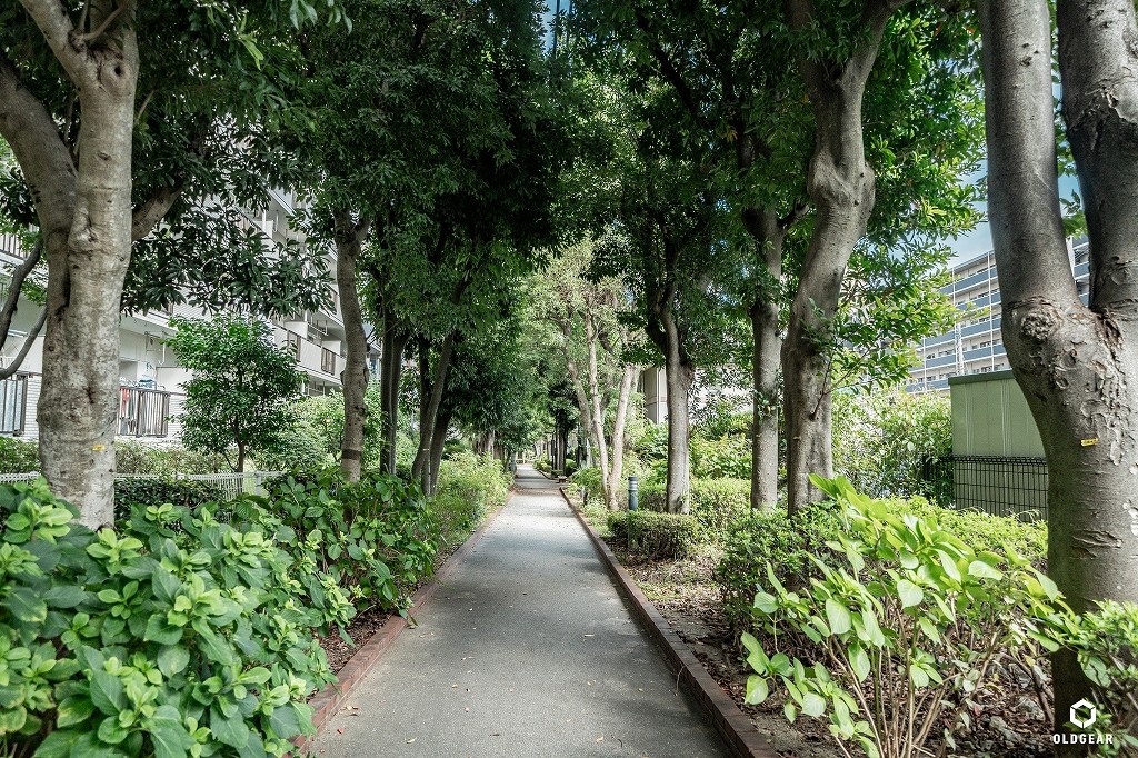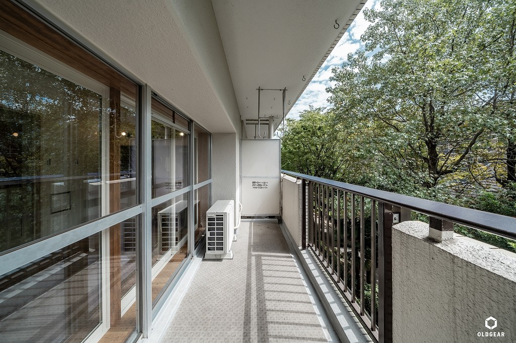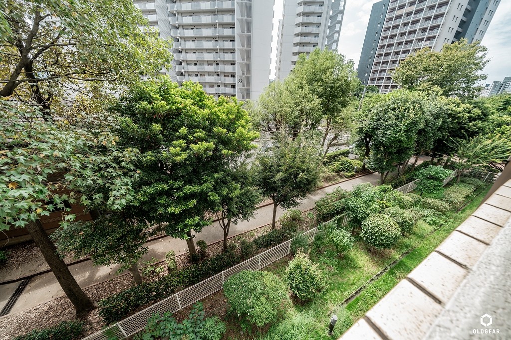 高層マンションに囲まれた立地ながら、南向きのバルコニーから望めるのは隣の建物ではなく緑道の木々。低層階でも開放感と癒しのある景色を楽しめる、希少な住戸です。