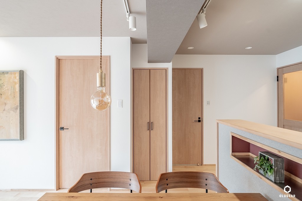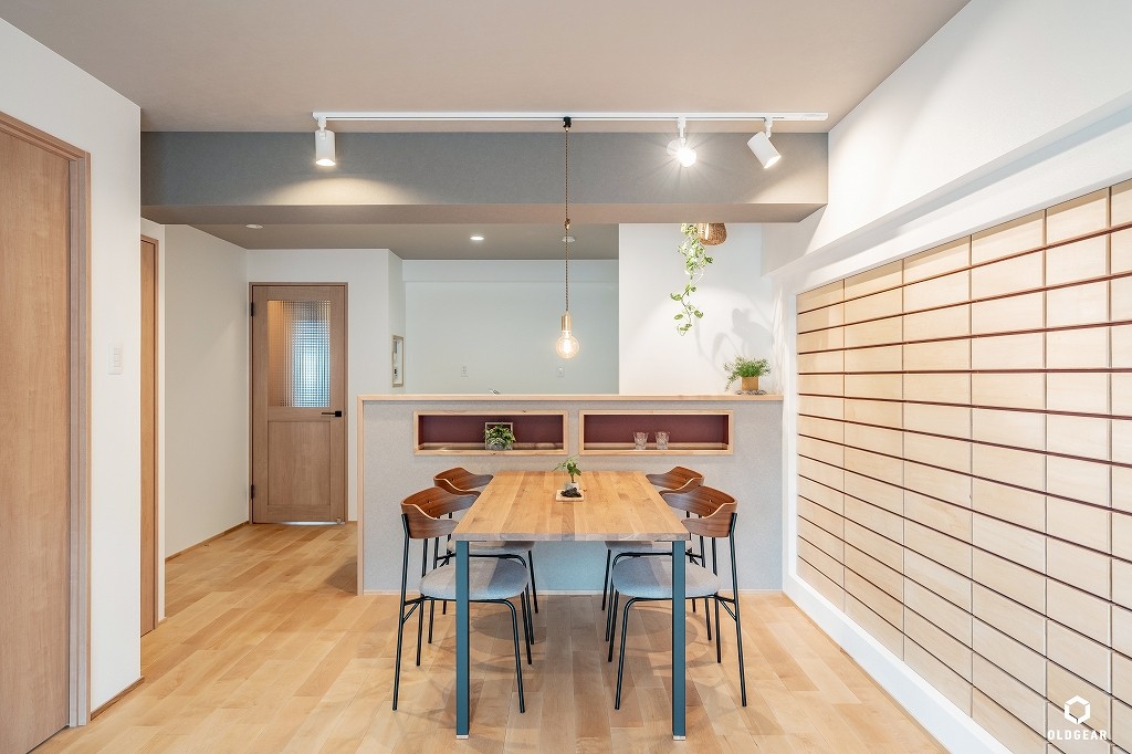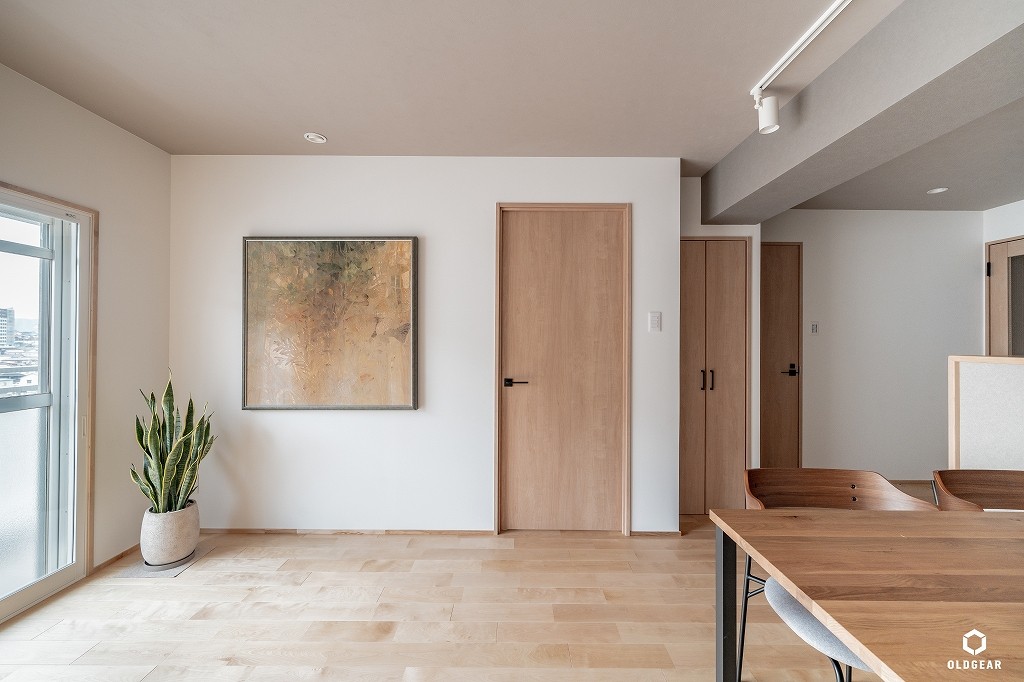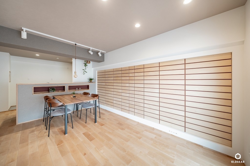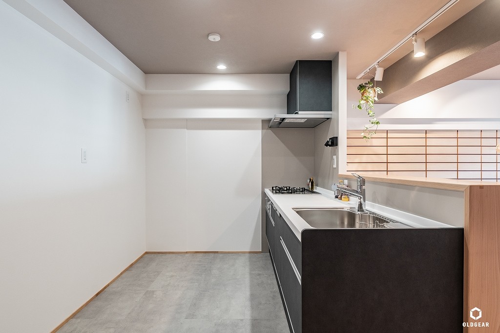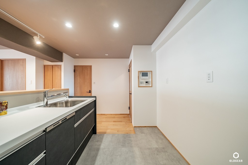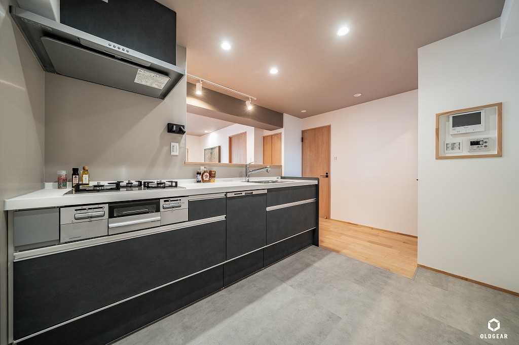 【断熱性能向上】(バルコニー側)インプラスLow-E二重窓+断熱材24K追加・システムキッチン(食洗機・浄水器付・人大・タイル)+ブナ材の造作カウンター・ユニットバス(浴室乾燥暖房機付)・洗面化粧台・トイレ(温水洗浄機付)・壁紙・無垢床(バーチ)・ウッドタイル・LEDダウンライト・建具・給水給湯管更新など