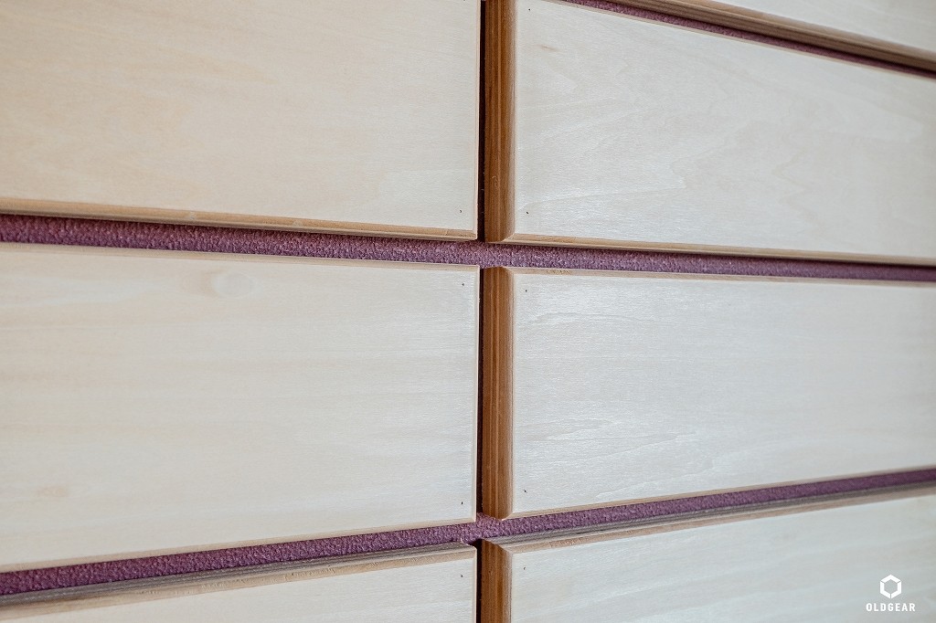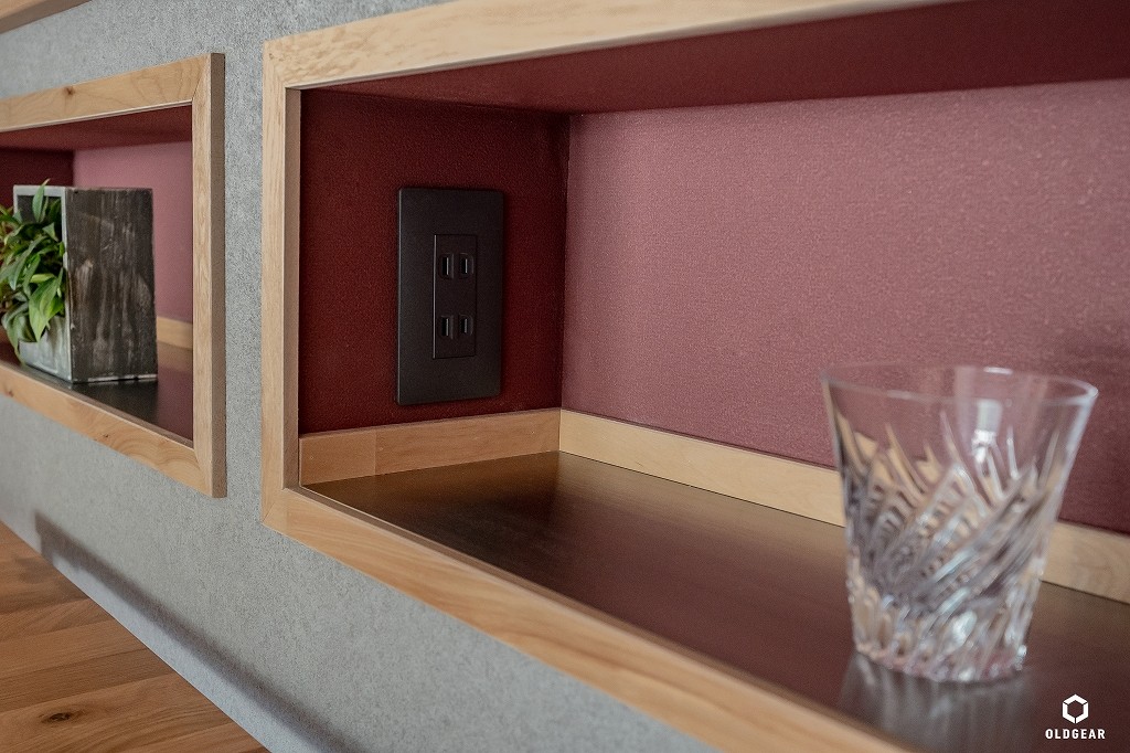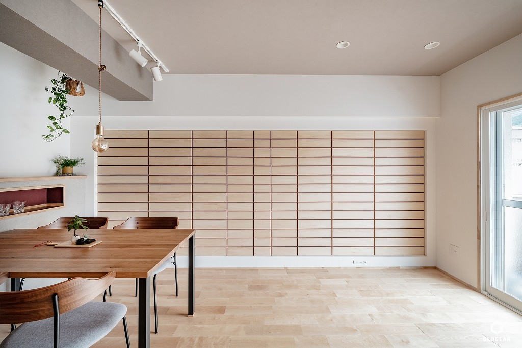 室内の仕上げは「自然」をテーマに、床はバーチの無垢材を採用。リビングの壁には、現地の寸法に合わせて一枚ずつ製作したウッドタイルを贅沢に使用しました。 塗ったかどうか分からないほど自然な風合いにオイルで仕上げ、1枚ずつ丁寧に施工しています。またキッチンカウンターにはブナ材を採用。職人の手仕事により磨き上げられた天板は、素材の質感を損なわない特別なガラスコーティングを施し、特別な存在感を放っています。