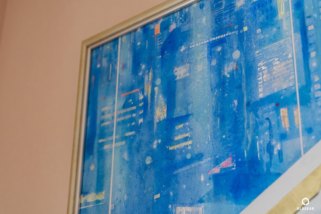その景色は、日本画家能登真理亜先生の「Swim the Night」のブルーとリンクし、外と中がひとつにつながるような心地よさを生み出しています。