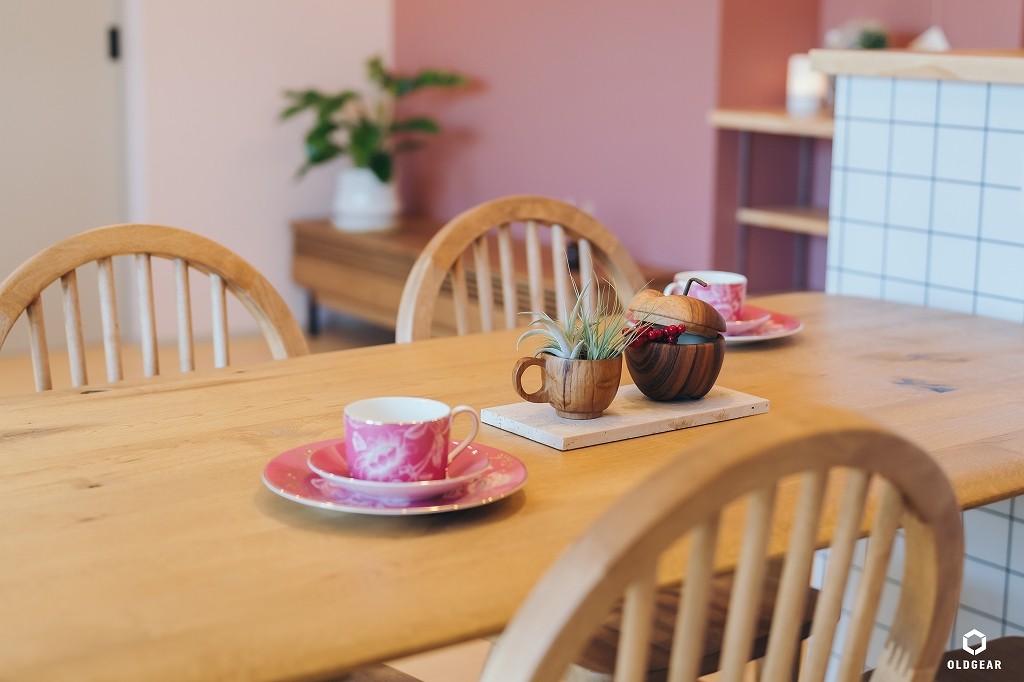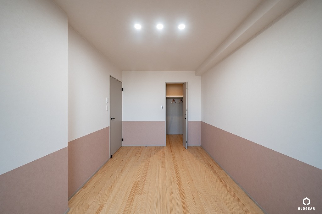 お部屋にはラズベリー色の壁紙と、パインの無垢材のナチュラルな質感をプラス。
