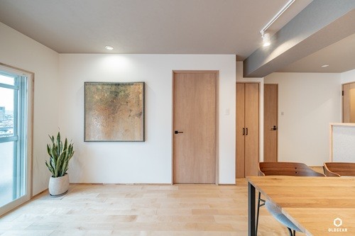 室内仕上げは「自然」をテーマにバーチの無垢床にリビングの壁には現地の寸法に合わせて1枚ずつ作成したウッドパネルを。