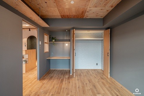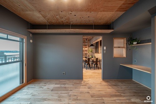 主寝室は天井から棚を吊るし本棚を造作したり、造作ディスクも創り充実。