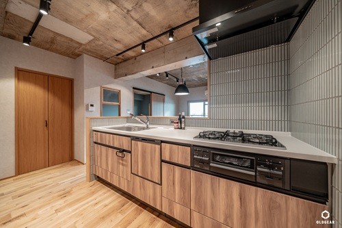 リビングに入ると無垢材とコンクリートの表し天井が温かさとカッコよさを備えた空間に。リゾート感を出す為に冷蔵庫を隠せるよう冷蔵庫置場に奥行きを持たせパントリーも内部ができるだけ見えないように設計。